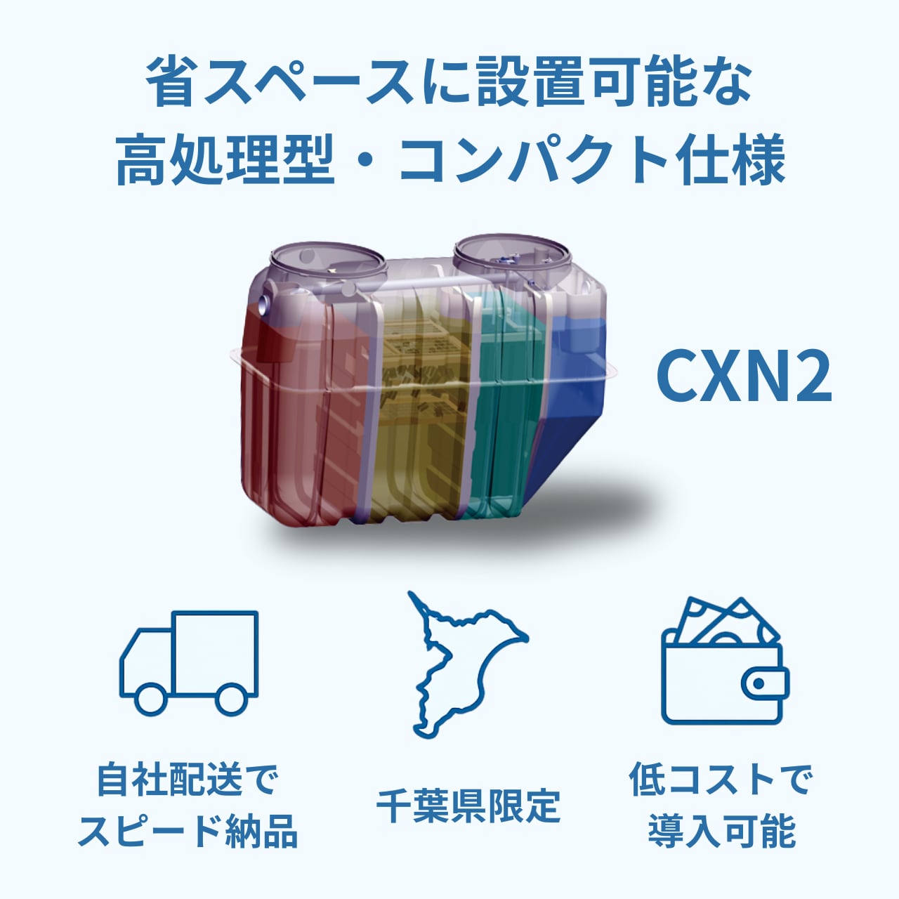 信頼と実績のあるアムズ社製「CXN2型」浄化槽を、千葉県内限定で販売中。